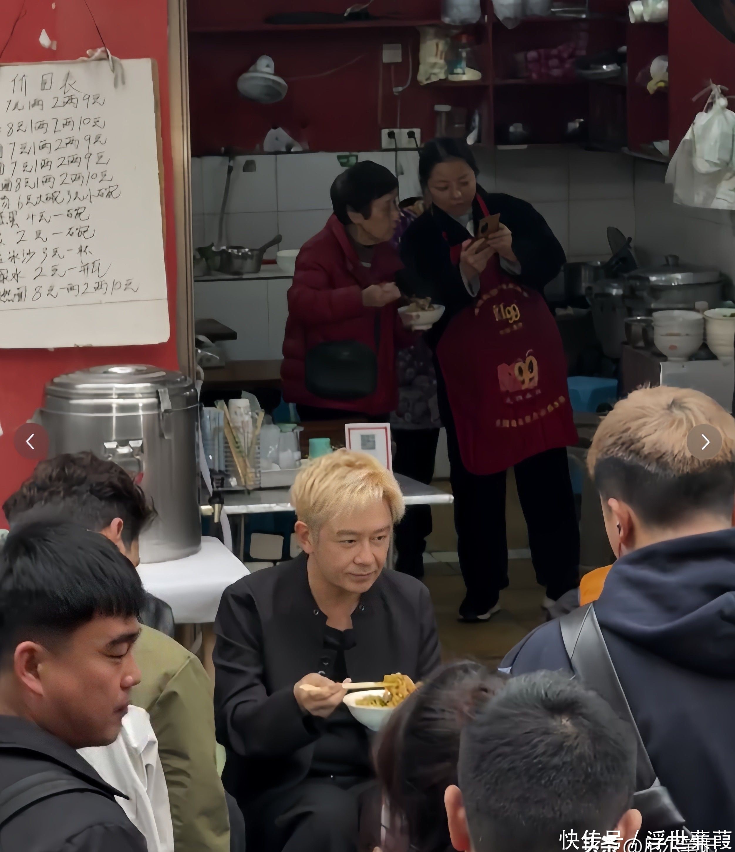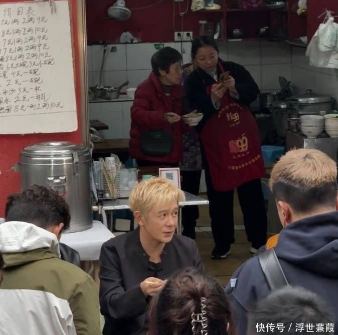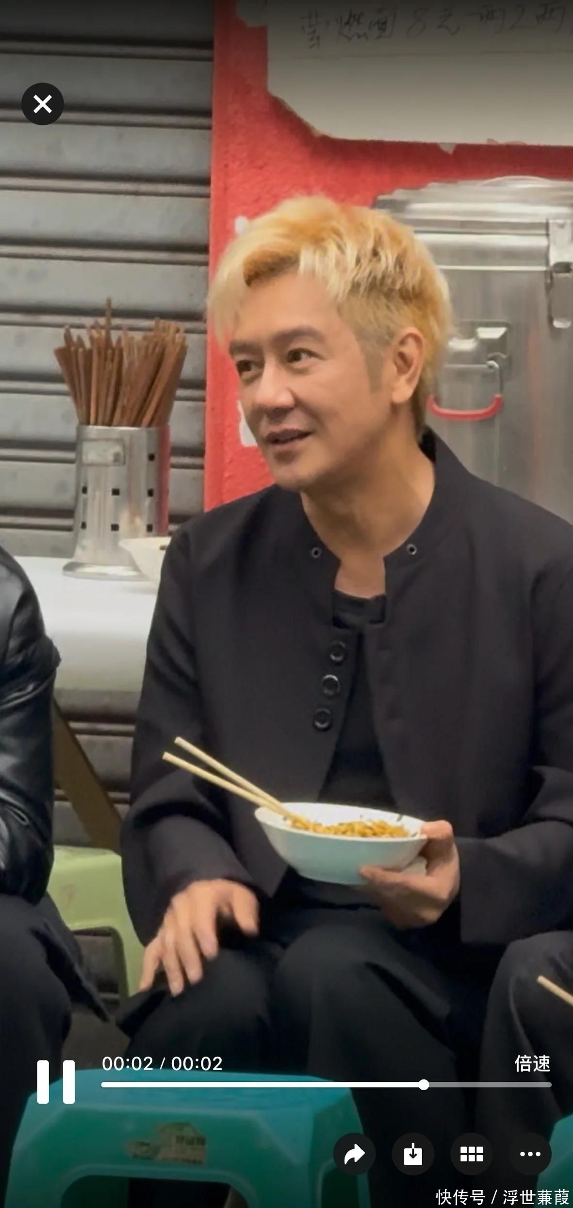 陈浩民一头显眼的金黄色短发在阳光映照下格外抢镜,身穿休闲夹克,双手端碗埋头进食,身形消瘦得几乎认不出当年《济公》中风流倜傥的模样。