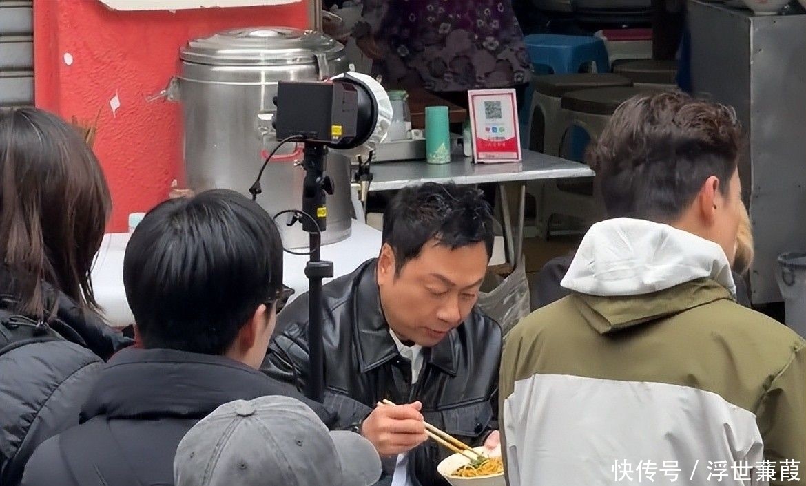 黎耀祥面带朴实笑容,外披宽松皮衣,一边咀嚼一边与身旁同伴谈笑风生,神情自然得如同在家门口闲话家常。