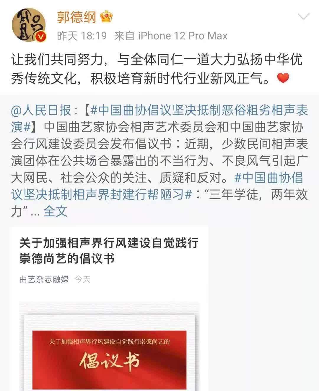 与以往沉默不同的是,郭德纲这次没有选择他以往听之任之、任凭网友猜度的态度。而是在4月的最后一天,新分社开业的前一天拥护了这篇倡议书。