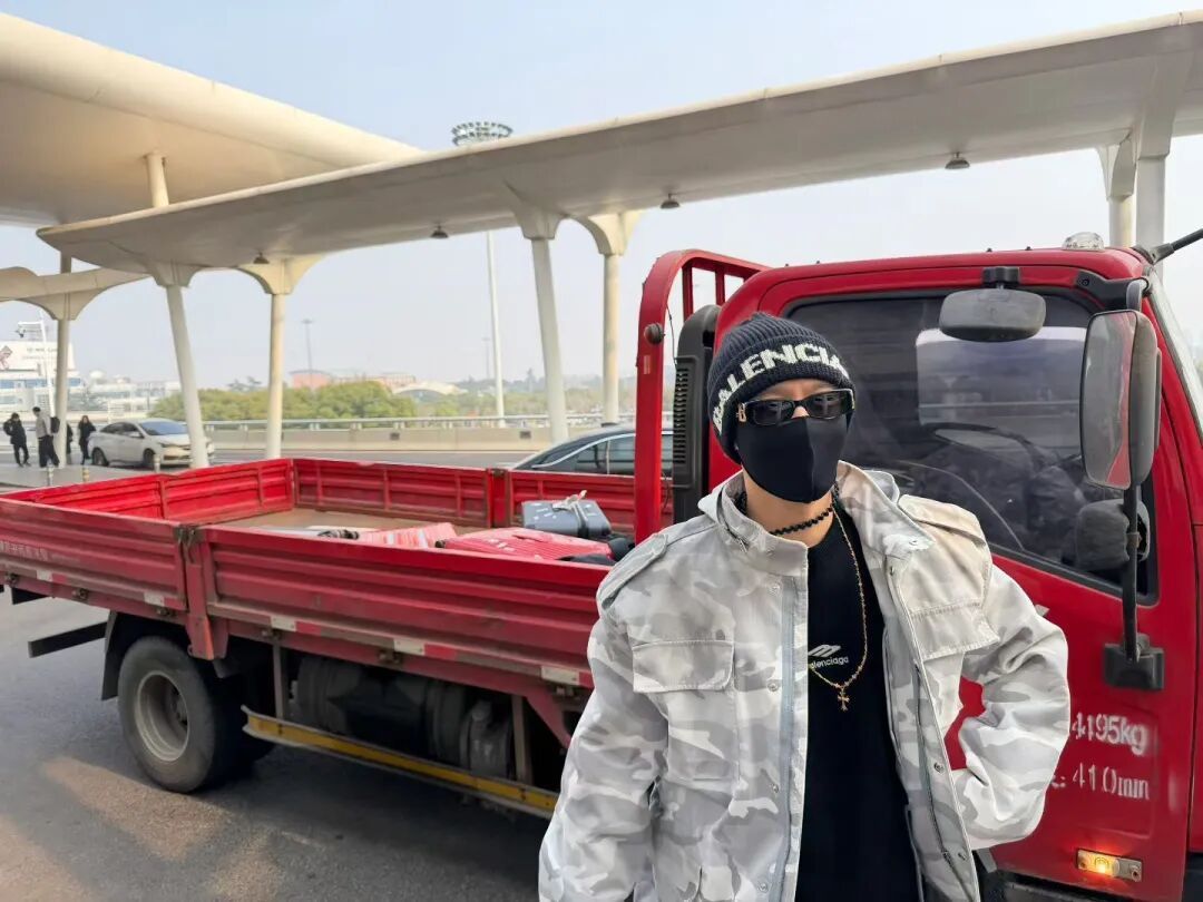 另一张照片显示,到达机场后,黄晓明戴着帽子、墨镜、口罩站在那辆红色的卡车旁边合影,他的几件行李放在卡车后面。